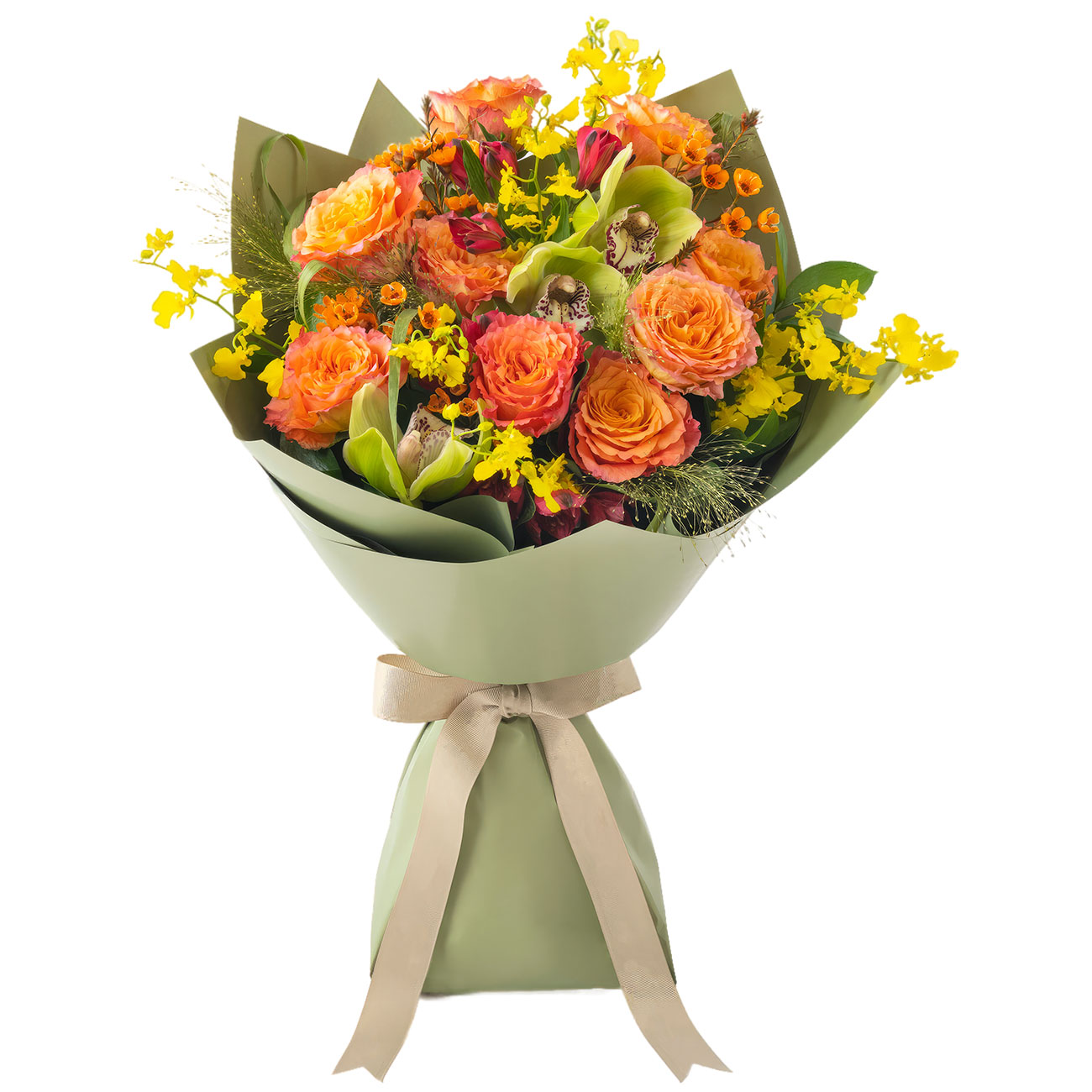 Роза одноголовая оранжевая, орхидея желтая, альстромерия красная, ваксфлауэр оранжевый, зелень. Упаковка (лента, пленка, крафт, сетка, пленка матовая)