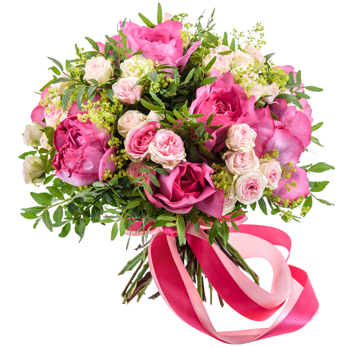 Роза одноголовая розовая, роза кустовая белая, фисташка, зелень. Упаковка (лента, пленка, крафт, сетка, пленка матовая)
